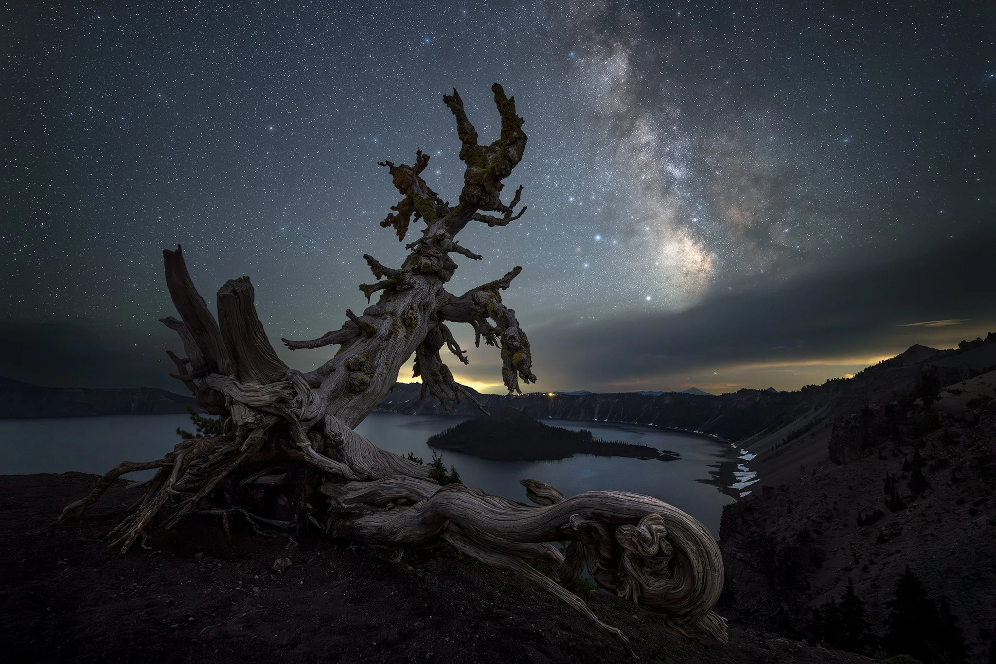 “The Sentinel” at Crater Lake National Park as Klamath Falls and Medford glow on either side of the Milky Way.