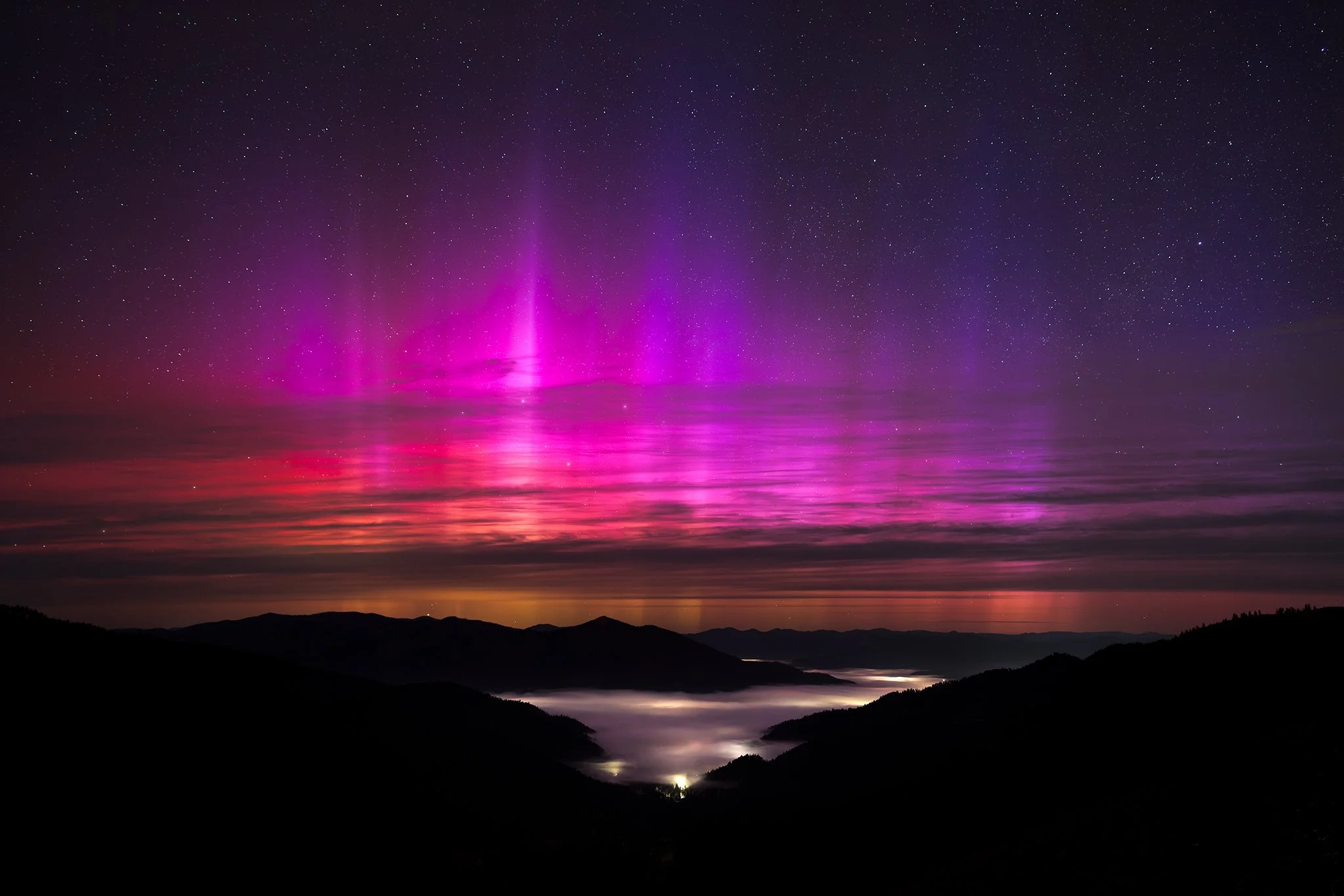 Northern Lights fill the sky over a fog inversion and the town of Rogue River, Oregon.