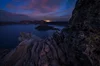 The Coquille River Lighthouse in Bandon Oregon as a Crab Boat Glows on the Horizon